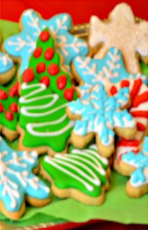 Vanilla flavored cookies cut in Christmas theme shapes.  These cookies are decorated for the season in a variety of frosting colors and sprinkle accents.  Approximately 1 lb. by weight.